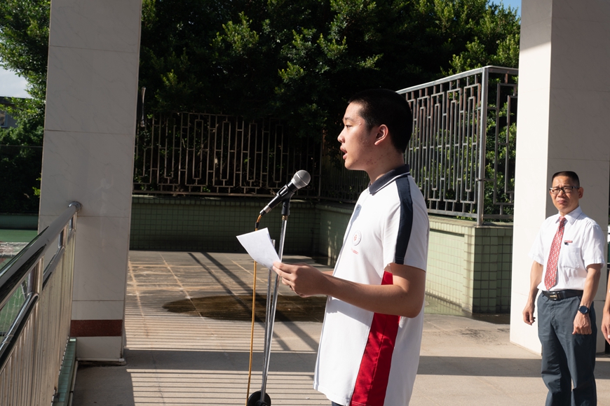 在庄严的升旗仪式中,开学典礼拉开了序幕。奏唱国歌后,2020年全国青少年信息学奥林匹克竞赛金牌获得者、获得清华大学保送资格的高三(一)班陆宏同学作为学生代表发言。他结合自己参加竞赛的经历,鼓励全体同学坚持梦想,脚踏实地,不懈努力。他说,只要有信心,有决心,有恒心,就没有跨不过的山,没有趟不过的河。他在发言中感谢附中创造的良好学习环境,感谢老师和同学们一路的陪伴与支持。