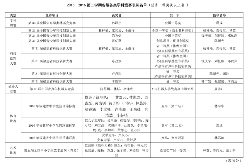 在各学科指导教师、教练和参赛同学的共同努力下,2015-2016学年第二学期我校学子参加各级各类竞赛取得了优异成绩。信息学奥林匹克竞赛、全国青少年科技创新大赛、青少年机器人竞赛、艺术展演四大类项目计共有6项17人次在国家级赛事中获奖;青少年科技创新大赛创意项目、体育比赛共有两大类项目计共有4项29人次在省级赛事中获一等奖。依据《福建师大附中各类学科竞赛和青少年创新大赛管理办法(修订稿)》有关规定,学校对省级赛事中获一等奖及以上的同学给予表彰。