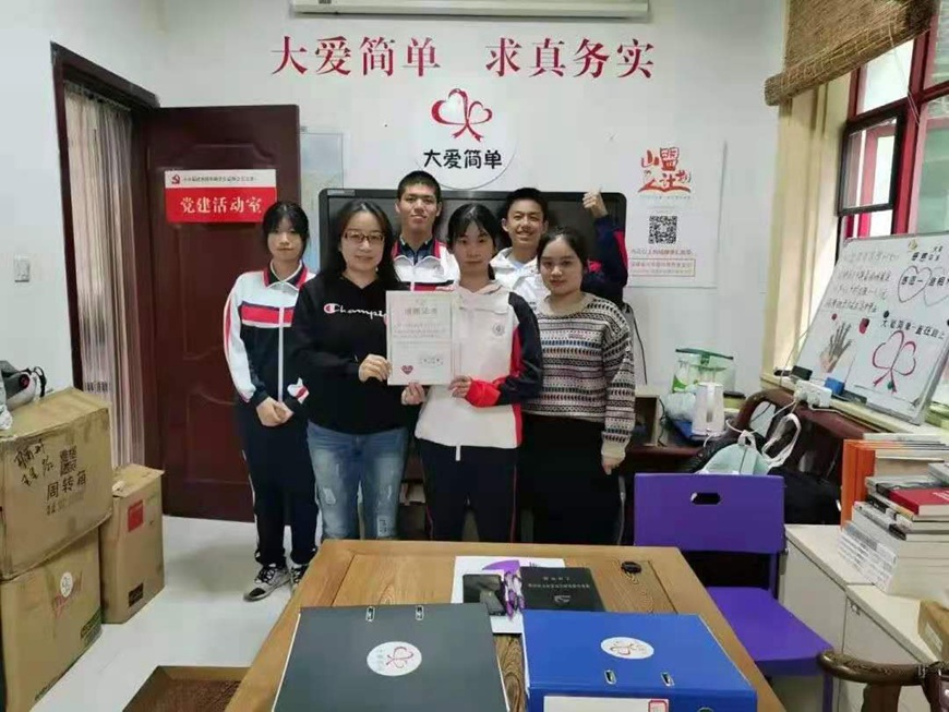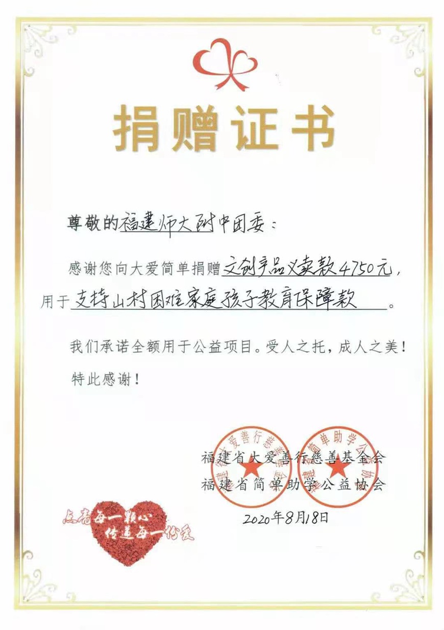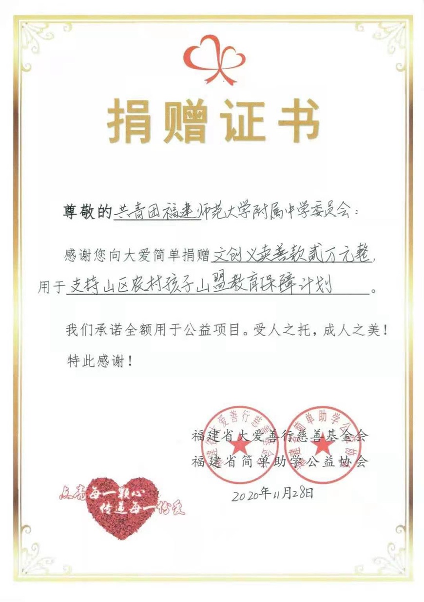 2020年11月29日,校团委副书记赵宇鑫老师及我校青年志愿者协会的四位同学前往福建省简单助学公益协会的工作室,代表校团委向“大爱简单”公益团队捐赠我校团委学生会在校运会期间义卖附中原创文创产品所筹得的善款2万元,用于支持山区农村孩子接受教育的“山盟教育保障计划”。