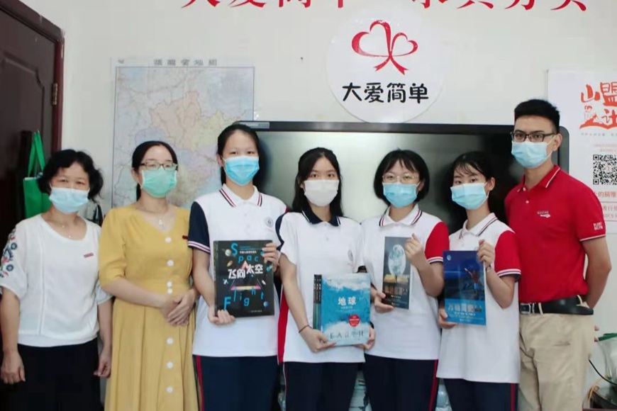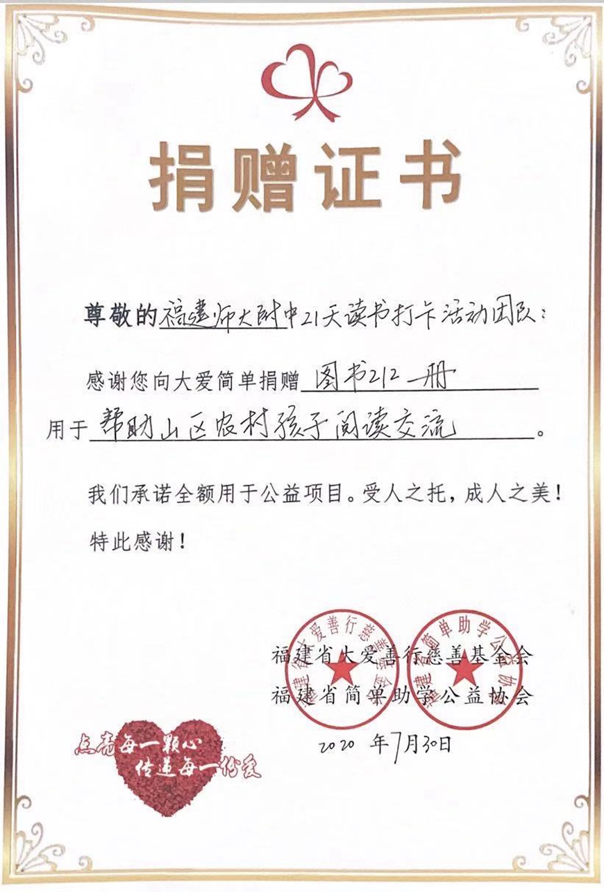 今年4-5月,图书馆联合团委于世界读书日组织发起21天读书打卡活动。打卡活动结束后,图书馆代表每一位完成全部21天打卡任务的同学捐赠1本书籍,图书馆馆长吴胜莲、团委书记陈志强以及参与活动的部分同学,前往简单助学工作室进行了图书捐赠仪式。