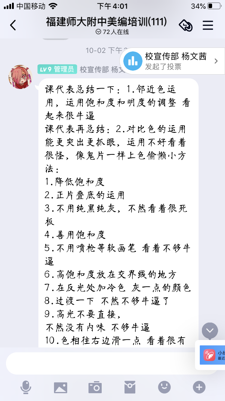 为提高我校学生干部的色彩运用及审美能力,提升学生宣传工作水平,2020年10月2日,校团委组织宣传部部员、各班宣传委员参加线上色彩培训。