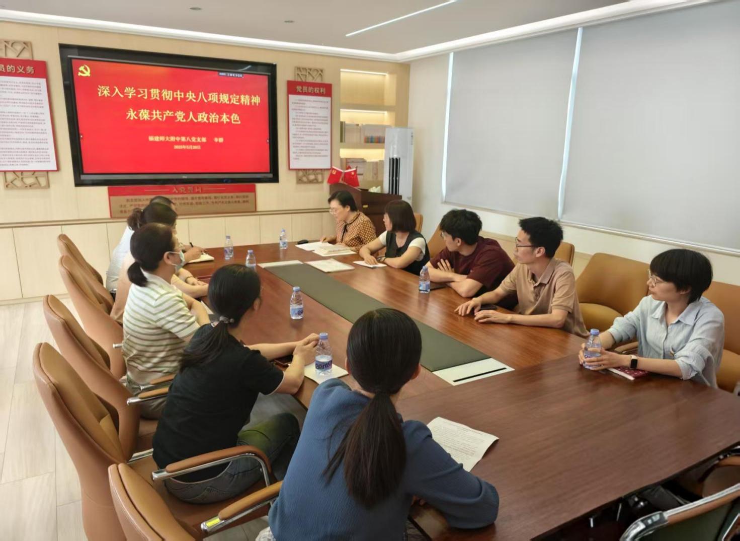 第八党支部书记辛群同志以《深入学习贯彻中央八项规定精神,永葆共产党人政治本色》为主题,从中央八项规定及其实施细则精神的主要内容、内涵和意义、当前还存在的问题及如何结合实际落实中央八项规定精神等方面进行讲述。通过学习,党员们纷纷表示,作为行政工作人员,将立足岗位,倾情服务师生,筑牢廉洁防线,切实做到廉洁自律、勤勉尽责。时刻牢记党的纪律和规矩,自觉遵守中央八项规定要求,永葆共产党人的政治本色。
