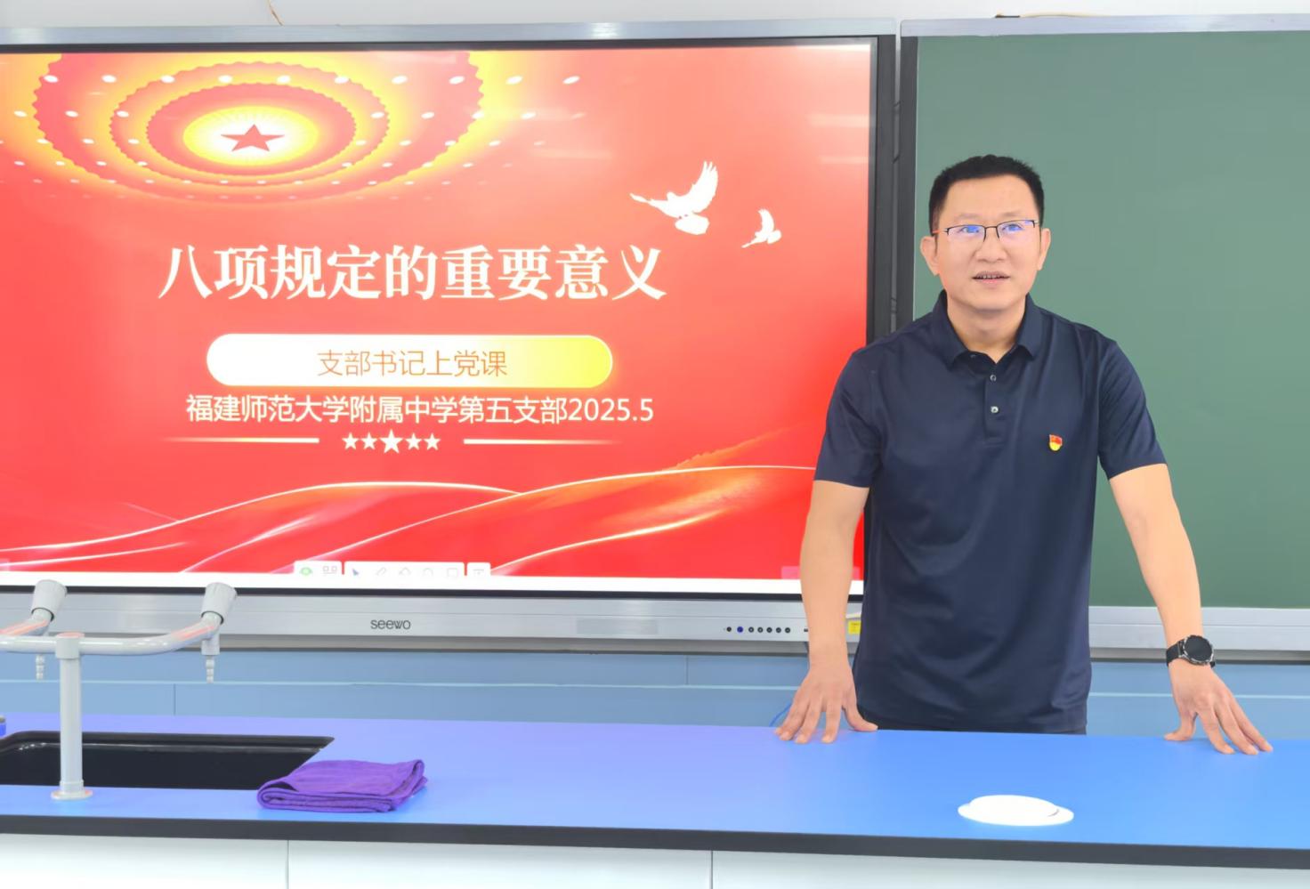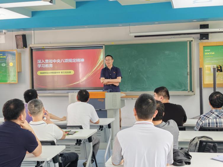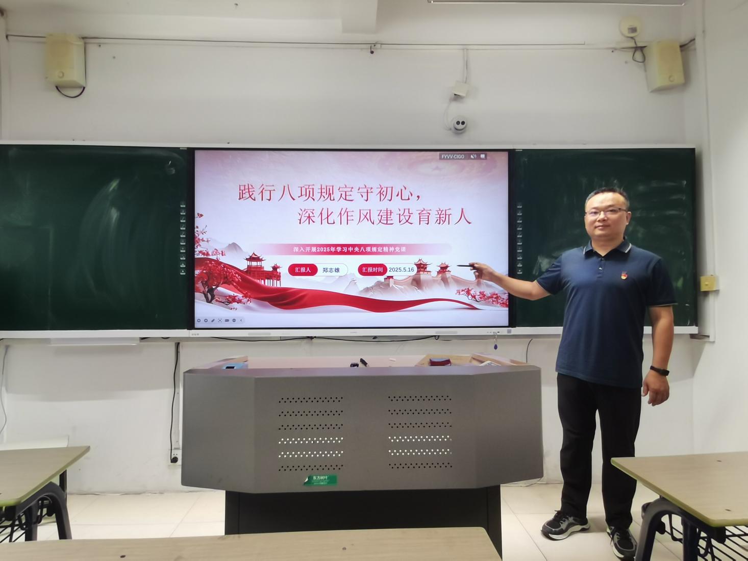 第十一党支部书记郑志雄同志以《践行八项规定守初心,深化作风建设育新人》为题,为支部全体教师党员讲授专题党课,从深刻认开展学习教育的重要意义、学习中央八项规定精神的宝贵经验、持续落实中央八项规定精神三个方面展开授课。同时,结合实际案例,分析了违反中央八项规定精神的严重后果和对党风廉政建设的影响。党员们表示,通过此次党课学习,将始终保持清醒的头脑和坚定的信念,严格遵守中央八项规定精神和各项规章制度,为学生的成长和学校的发展贡献力量。