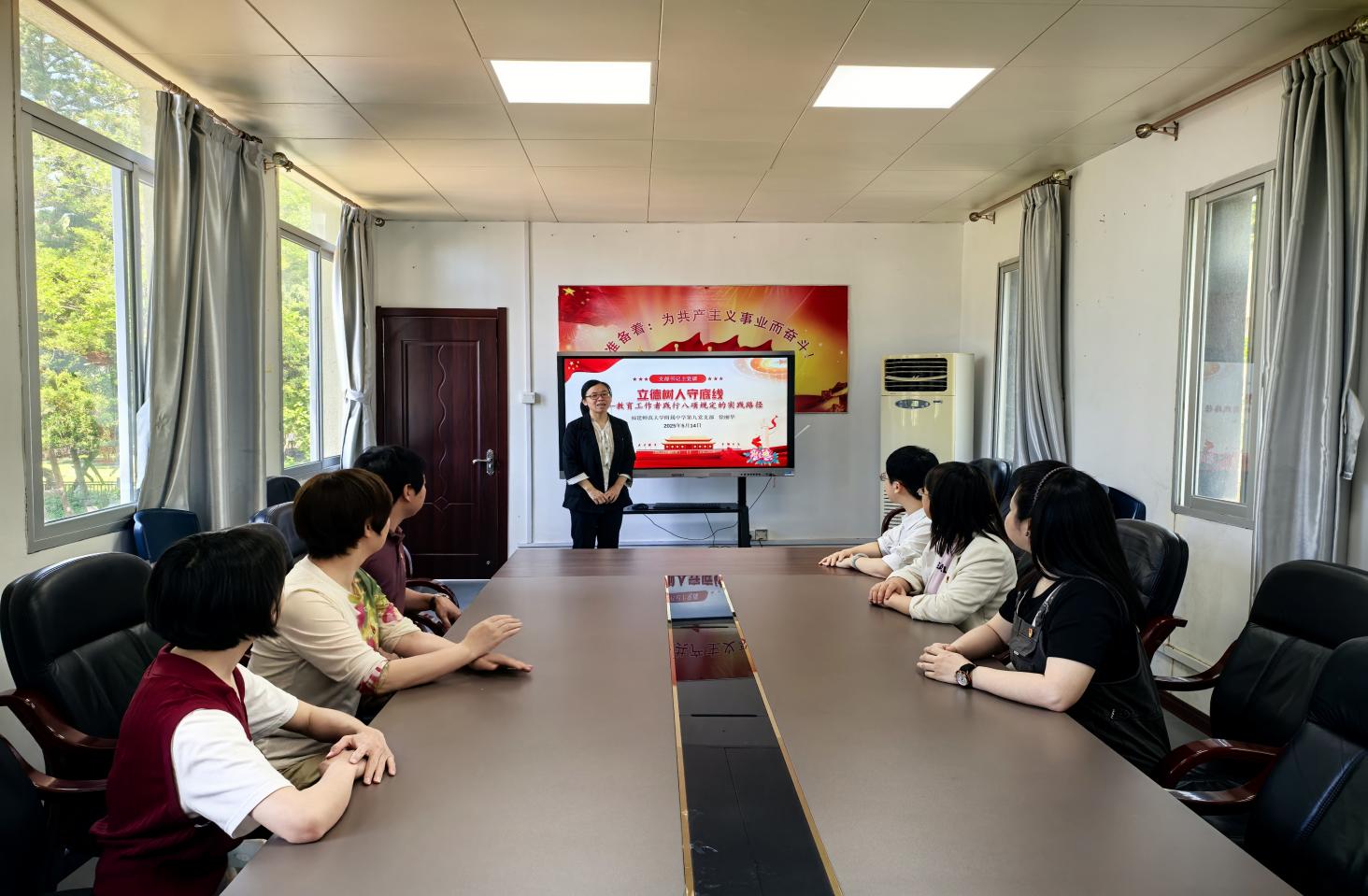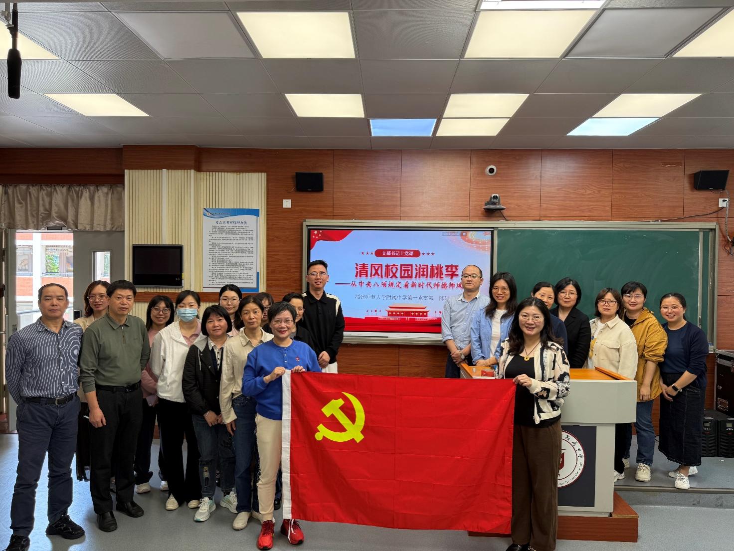 第九党支部书记徐丽华同志以《立德树人守底线——教育工作者践行八项规定的实践路径》为主题,从中央八项规定精神的核心要义、中央八项规定与教育工作的结合点、教育工作者践行中央八项规定的实践路径等方面展开授课。通过党课,党员们纷纷表示,作为党员教师,必须严守师德师风底线,在教育教学中自觉抵制不正之风,将廉洁从教融入日常,以清正教风引领学生成长。