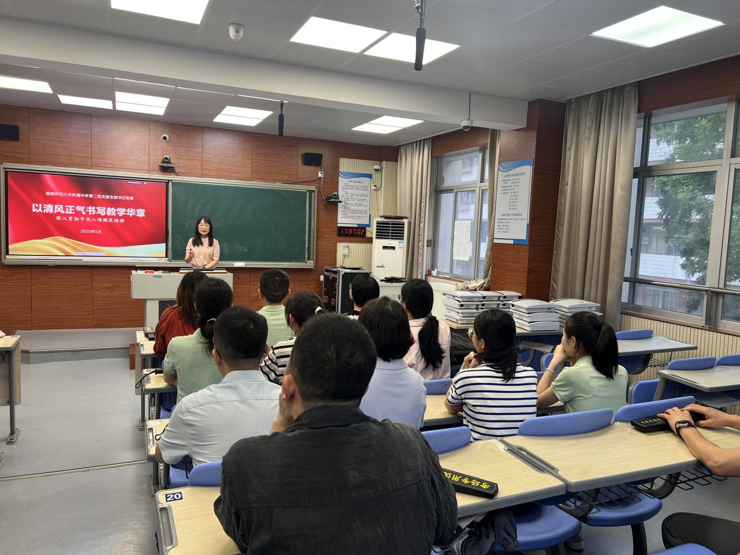 第二党支部书记石戈同志以《以清风正气书写教学华章》为主题,从“正风肃纪,巩固深化”“徙木立信,明心立志”“久久为功,化风成俗”三个方面展开授课。通过党课,党员们纷纷表示,将以此次党课为契机,加强党性修养,弘扬优良作风。在今后的教学工作中,严格自律,以实际行动践行中央八项规定精神,用清风正气书写教学华章,为学校教育事业发展添砖加瓦。