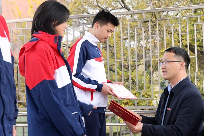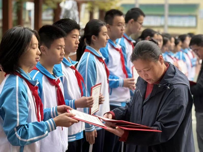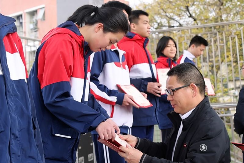 聘书颁发环节庄重有序。校领导及处室负责人共同为新晋干部颁发聘书,每一份聘书都承载着沉甸甸的责任。随后,初、高中部全体新任学生干部身着整齐校服,面向国旗庄严列队,进行就职宣誓。誓言铿锵有力、掷地有声,既展现了青年学子的蓬勃朝气,更传递出他们服务同学、建设校园的坚定决心。