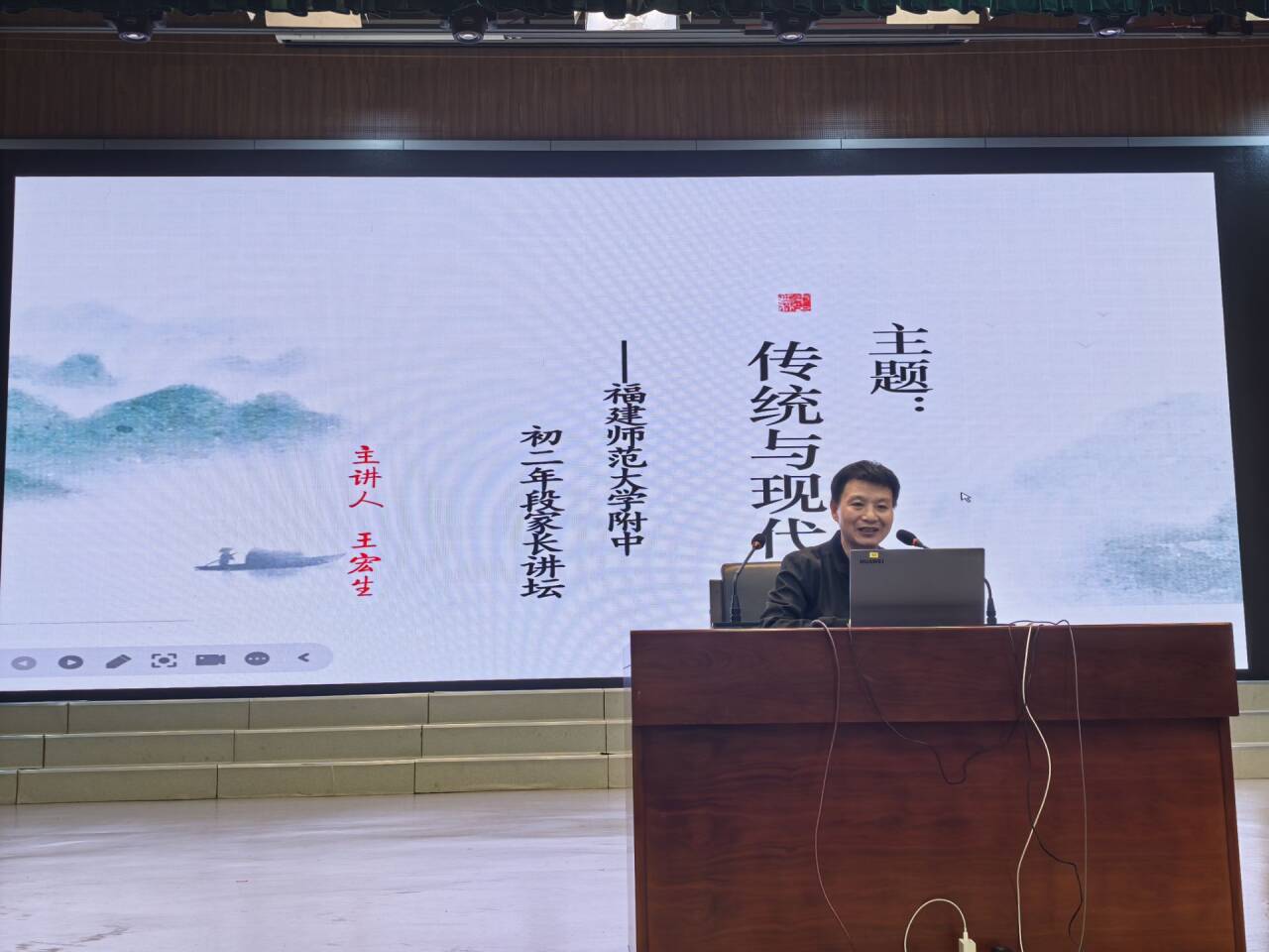2026年4月7日下午,我校报告厅内举行了一场名为“传统与现代”的专题讲座。本次活动特邀初二(5)班王韶彬同学的家长——南京大学中文系古典文献学专业博士、现福建师范大学文学院副教授、在职博士后王宏生教授,带领初二年段的同学们,以中国古典文献学为切入口展开了一场古今对话。