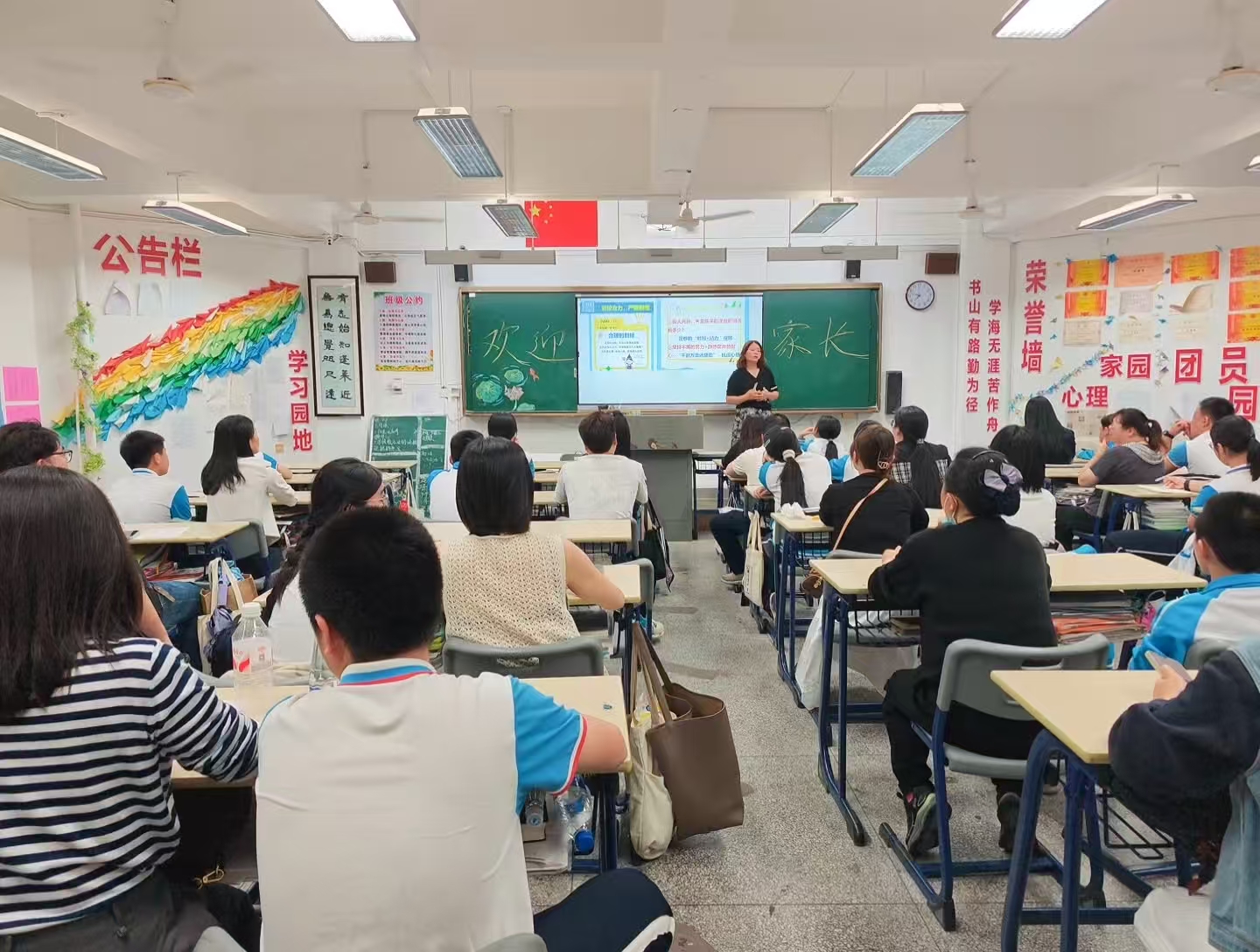 本次家长会分年段集中宣讲、学科精准指导、班级个别交流三个阶段开展。第一阶段,初二年段长黄新宇老师通过拉线广播做整体动员。黄老师指出,部分学生近期出现学习动力不足、状态波动等问题,尤其在地理、生物学科存在明显短板。他建议家长正视困难,协助孩子制定阶梯目标,做好电子产品管理、作息调整及心理疏导。